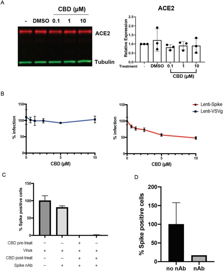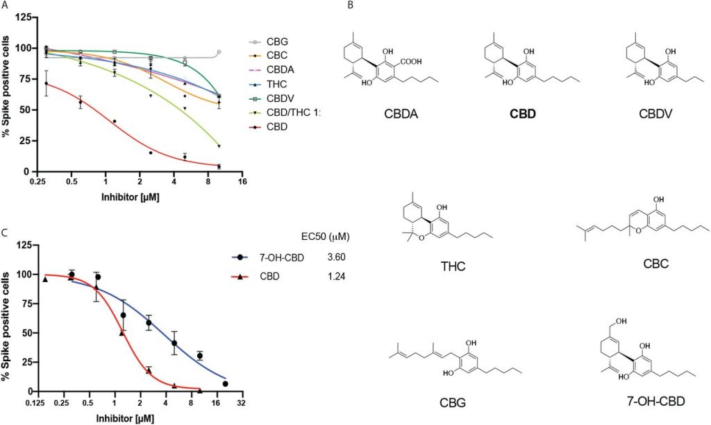 CBD was also effective at inhibiting SARS-CoV-2 spike protein expression in host cells even 2 hours after infection in the presence of antibodies to the spike protein to prevent reinfection during this time period.