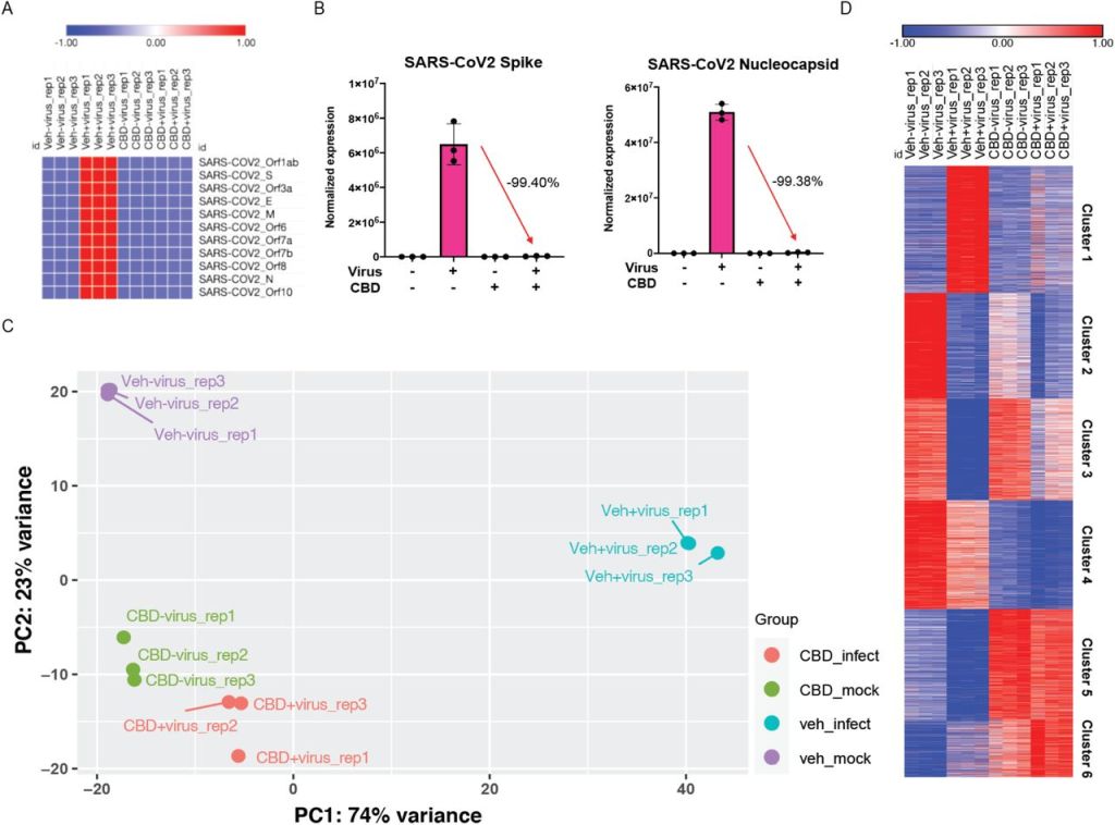 Consistent with this interpretation, RNA-seq analysis of infected A549-ACE2 cells treated with CBD for 24 hours shows a striking suppression of SARS-CoV-2-induced changes in gene expression. CBD effectively eradicated viral RNA expression in the host cells, including RNA coding for spike, membrane, envelope and nucleocapsid proteins.